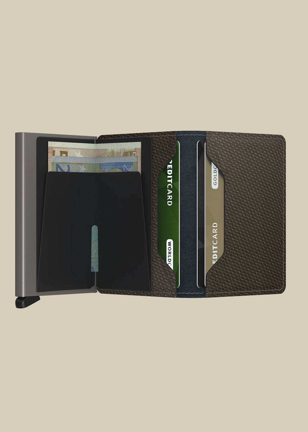 The Slimwallet is a modern take on the classic billfold. With its slim profile, it fits perfectly into every pocket. The open exterior is designed to accommodate cards, banknotes and receipts. The Cardprotector mechanism enables you to slide out cards with a simple motion, while the aluminium construction protects your cards from bending, breaking and unwanted wireless communication.