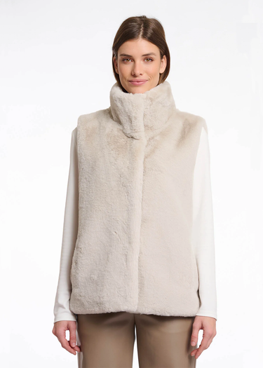 Short faux-fur waistcoat. This waistcoat features a high collar, push button closure and invisible side slit pockets. The material is so soft you can't resist to touch.