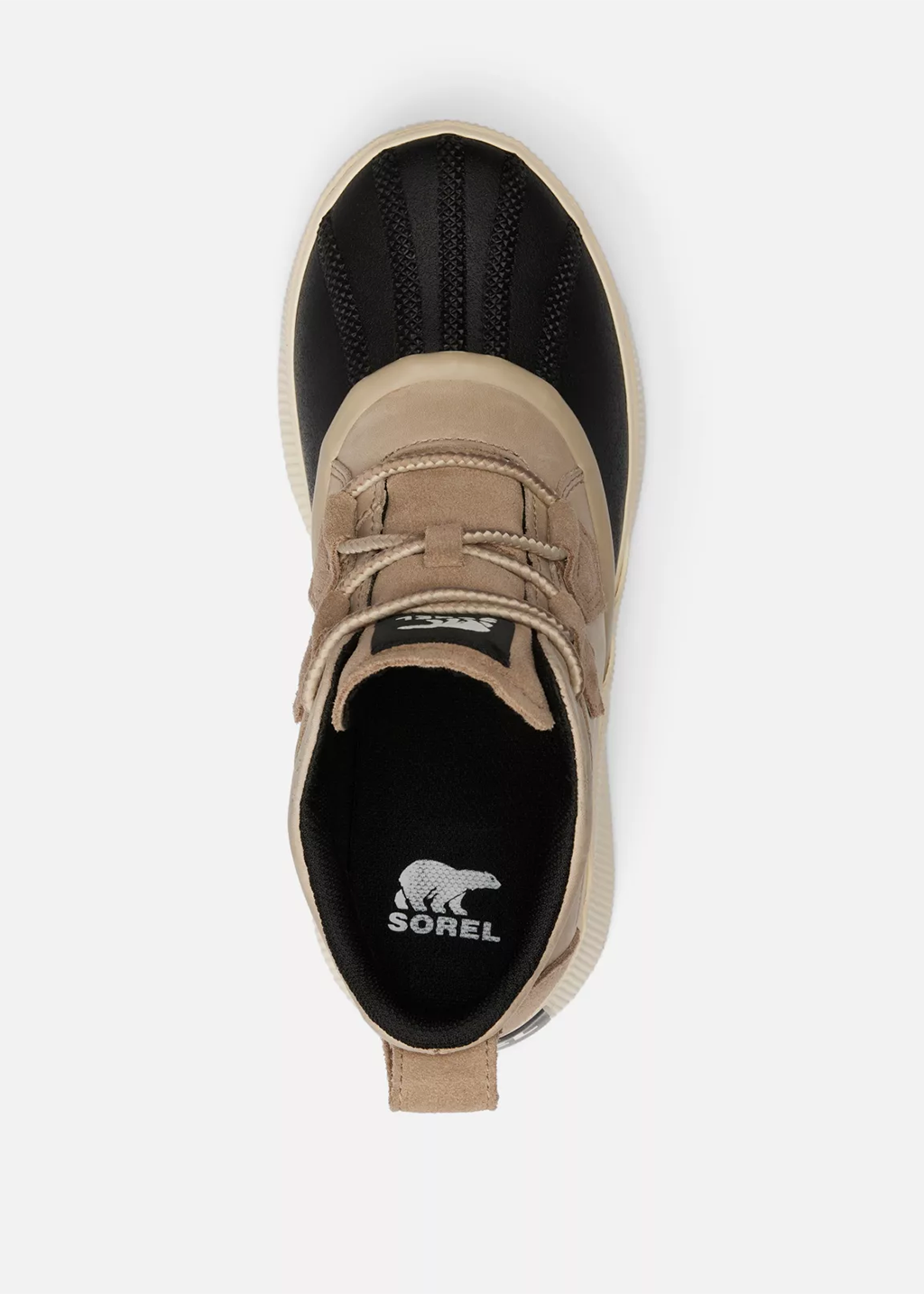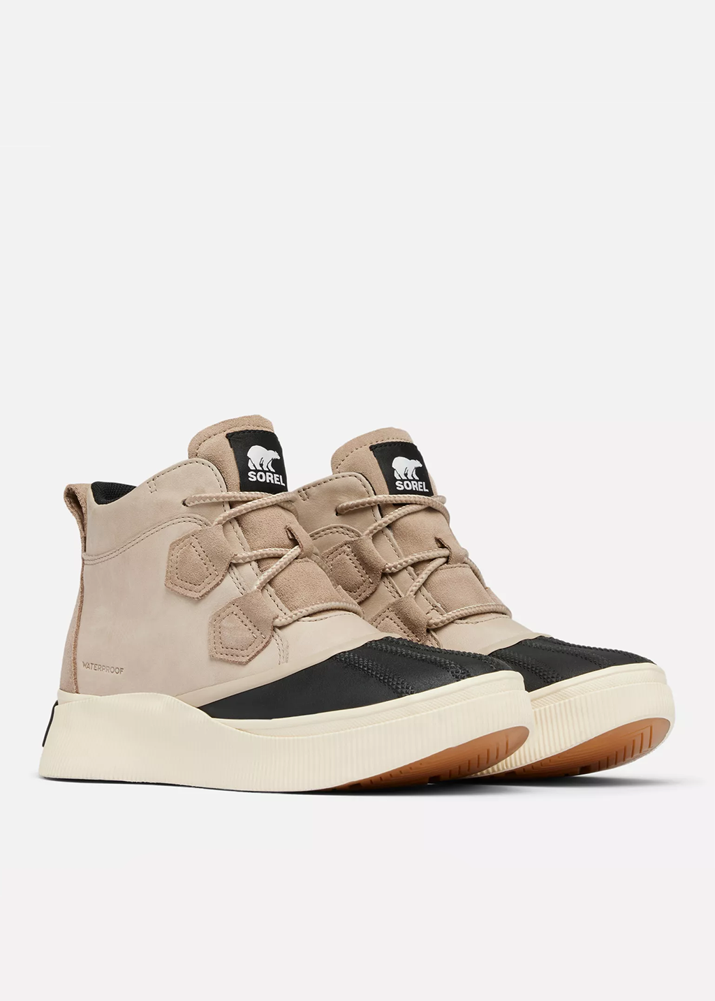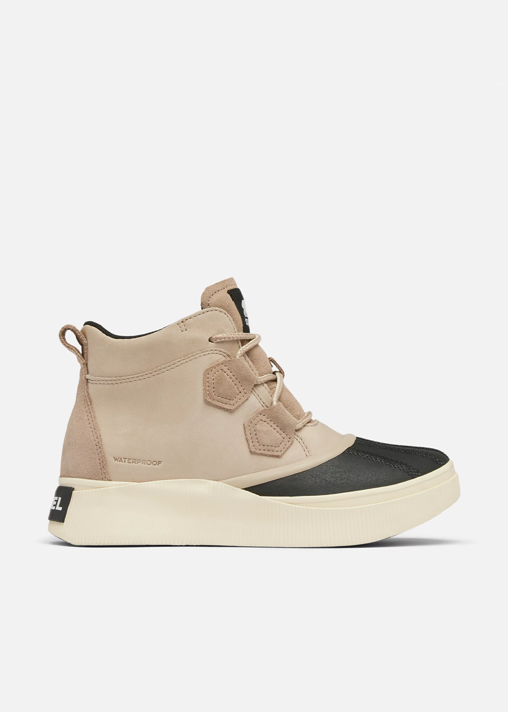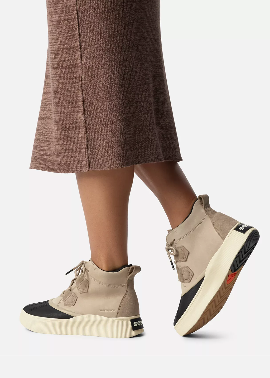 • Upper: Waterproof materials. Full grain leather and suede upper, felt and suede upper or suede with houndstooth textile. Heel pull tab. Lace closure. Textile lining. Waterproof bootie construction. Waterproof vulcanized rubber shell. Laces are not waterproof.