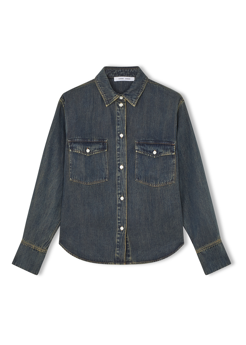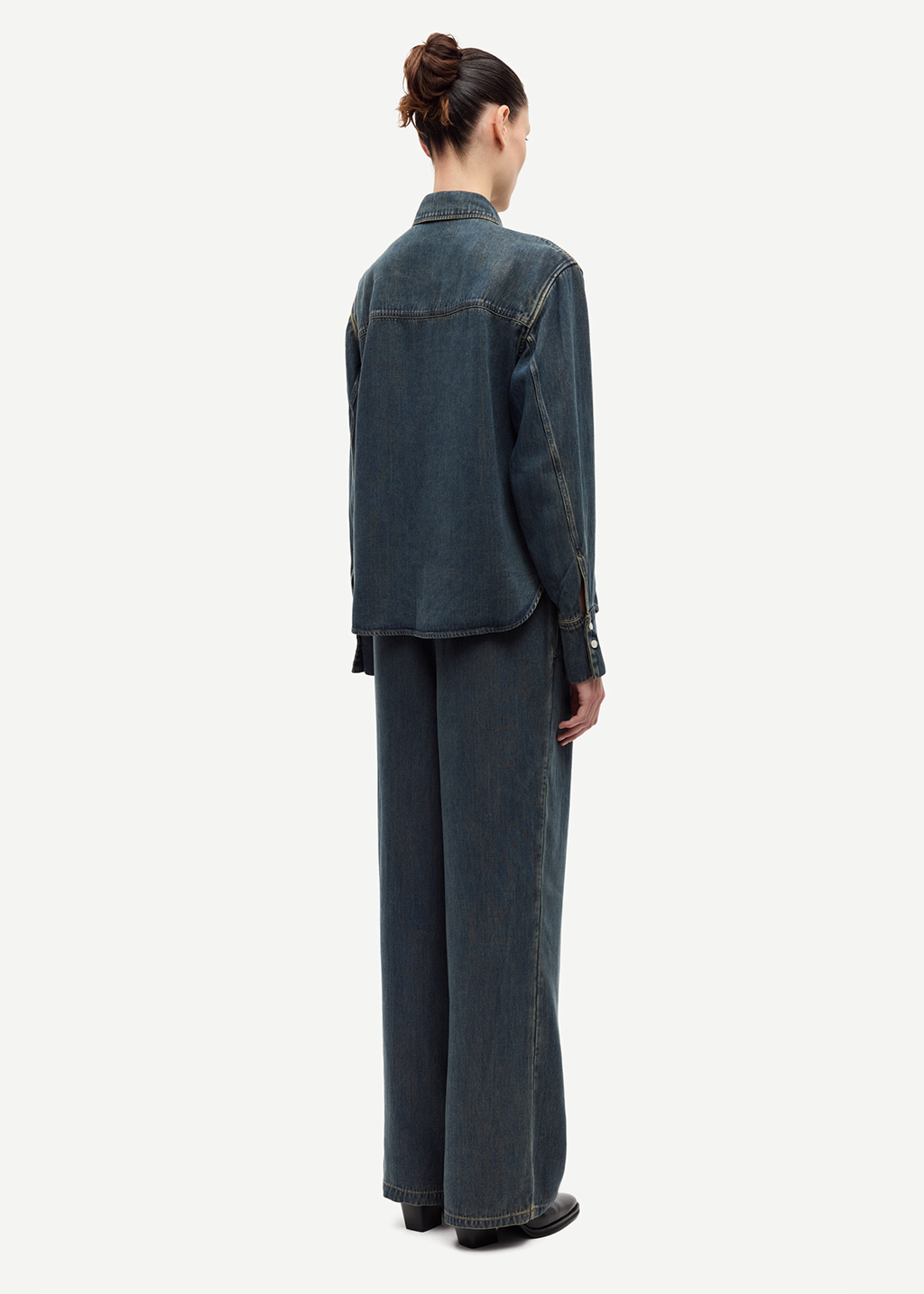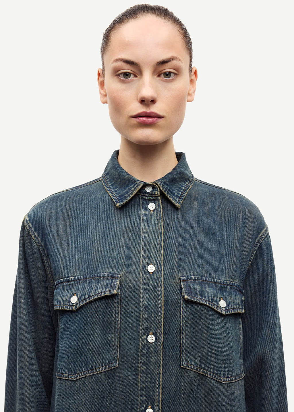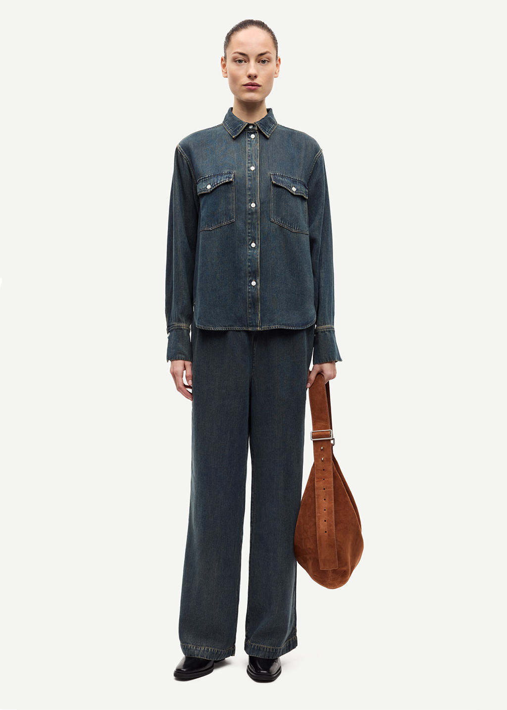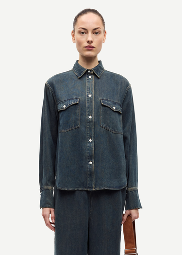Long-sleeve shirt with a regular fit and dropped shoulders, finished with a front button closure and buttoned cuffs. Features chest patch pockets, a neck yoke seam, and logo-engraved buttons throughout. Designed in a dark-wash, denim-inspired look.