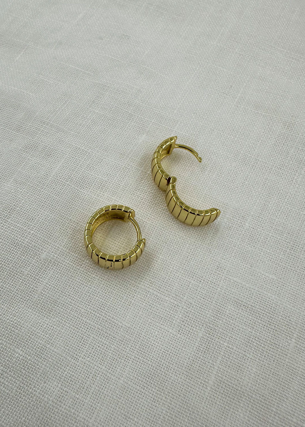 Introducing our Cali Huggie earrings, a Bella & Wren House Brand. Crafted with 18k Gold Vermeil, these huggie hoops are not only stylish but also lightweight, allowing for a comfortable fit all day long. With their textured finish, these earrings add an edgy twist to any outfit. Upgrade your accessory game with the Cali Huggie.