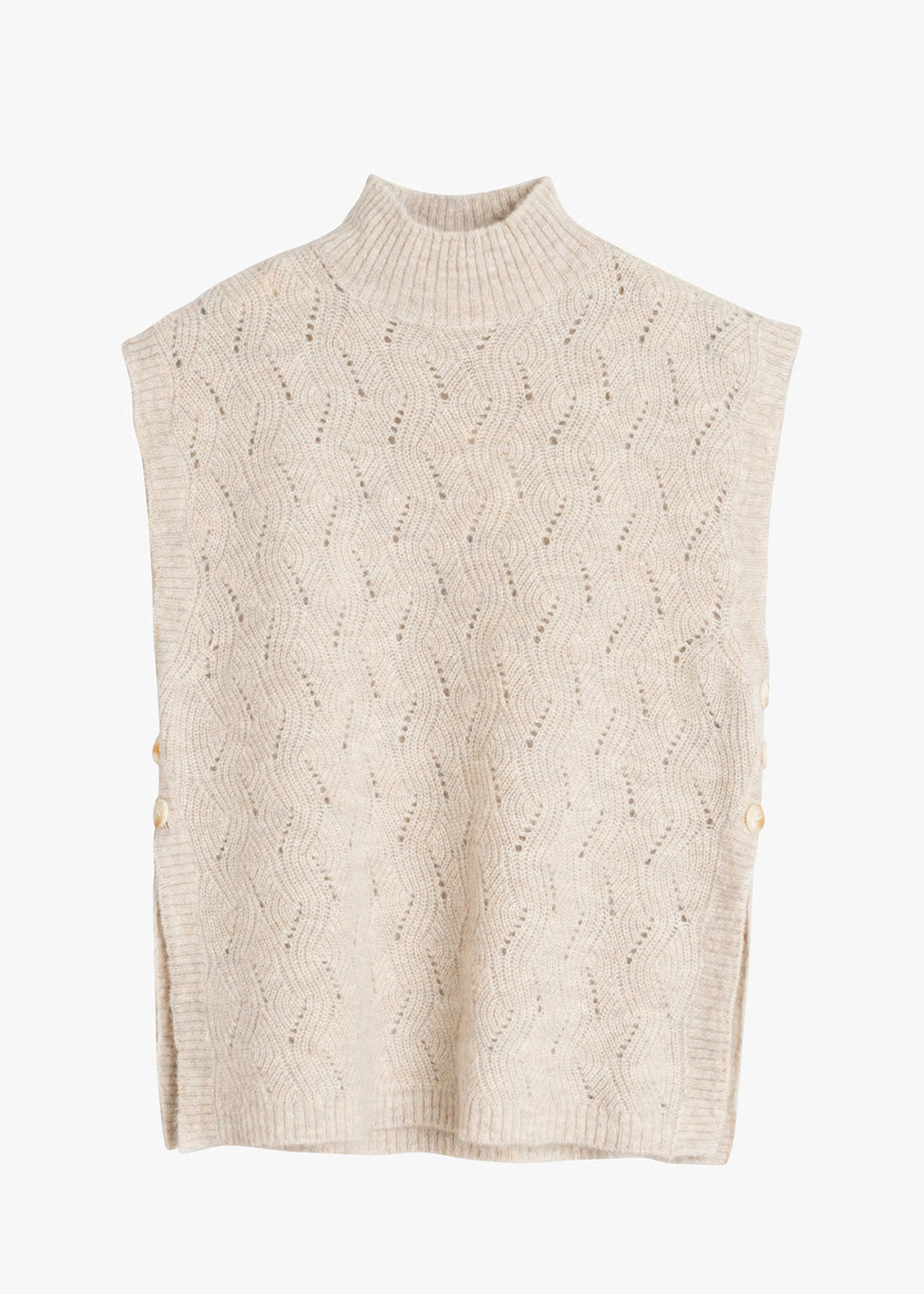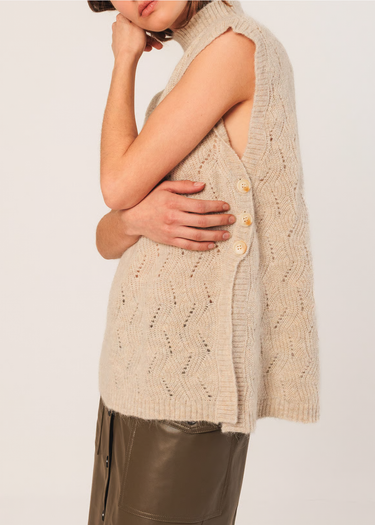 Crochet knitted vest with alpaca, featuring a stand-up collar and button closure on the sides. It also has slits and is perfect to wear over a romantic shirt.