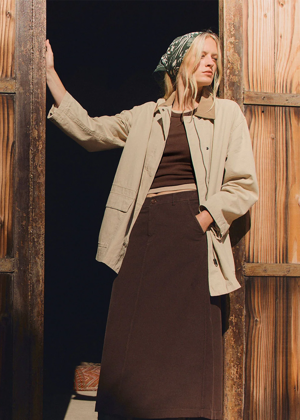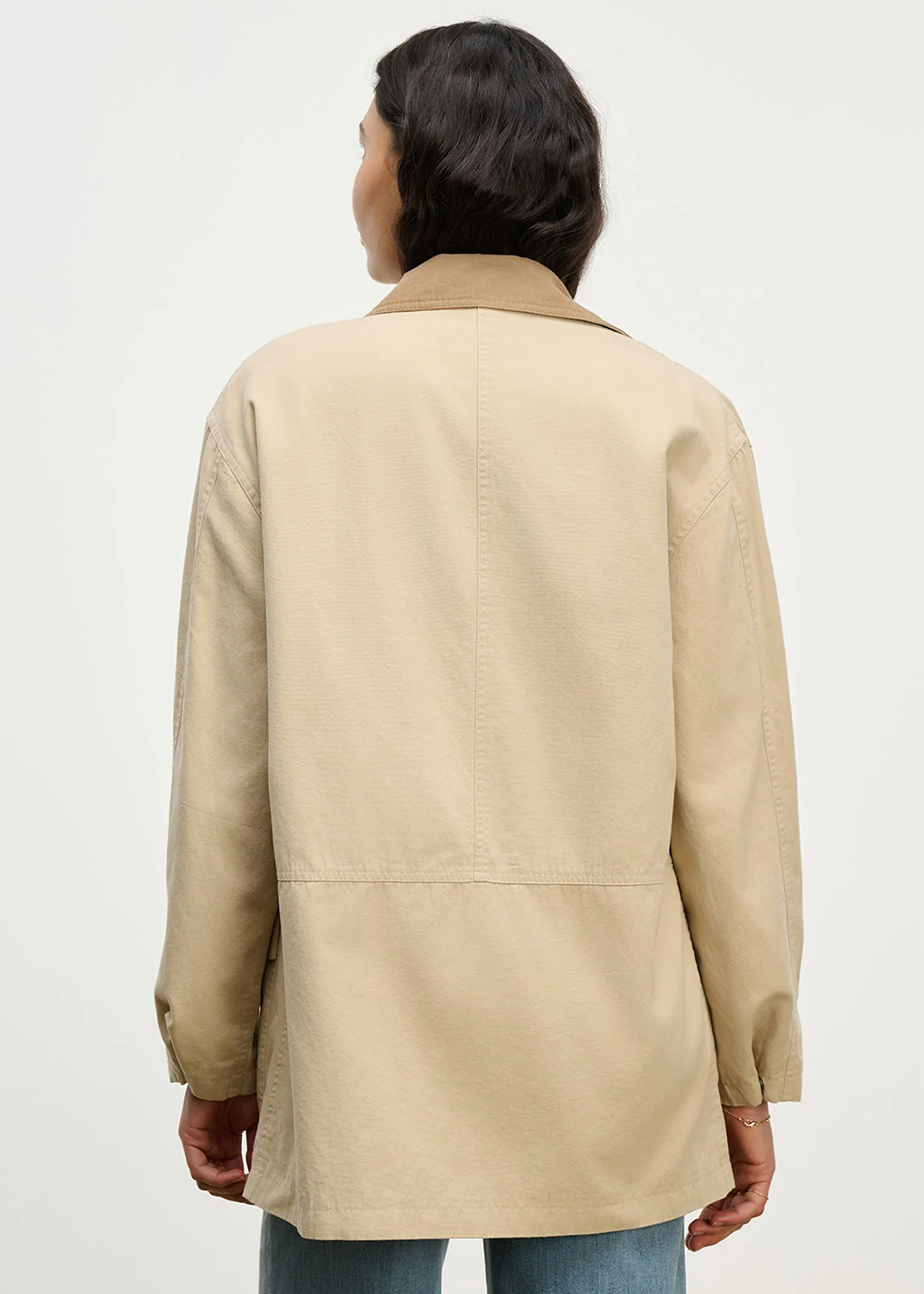 Crafted from midweight cotton canvas, this jacket features an oversized silhouette with a snap button and zipper front and two front flap pockets with secure snap closures. A contrasting collar and fully lined interior add refined details, while adjustable snap cuffs allow for a tailored or relaxed fit. A stylish layer built for everyday wear.