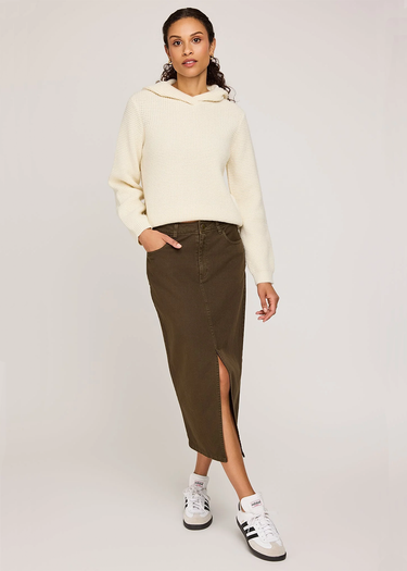 The Georgia skirt is made of a cotton twill fabric. Features include a front slit and five-pocket styling.