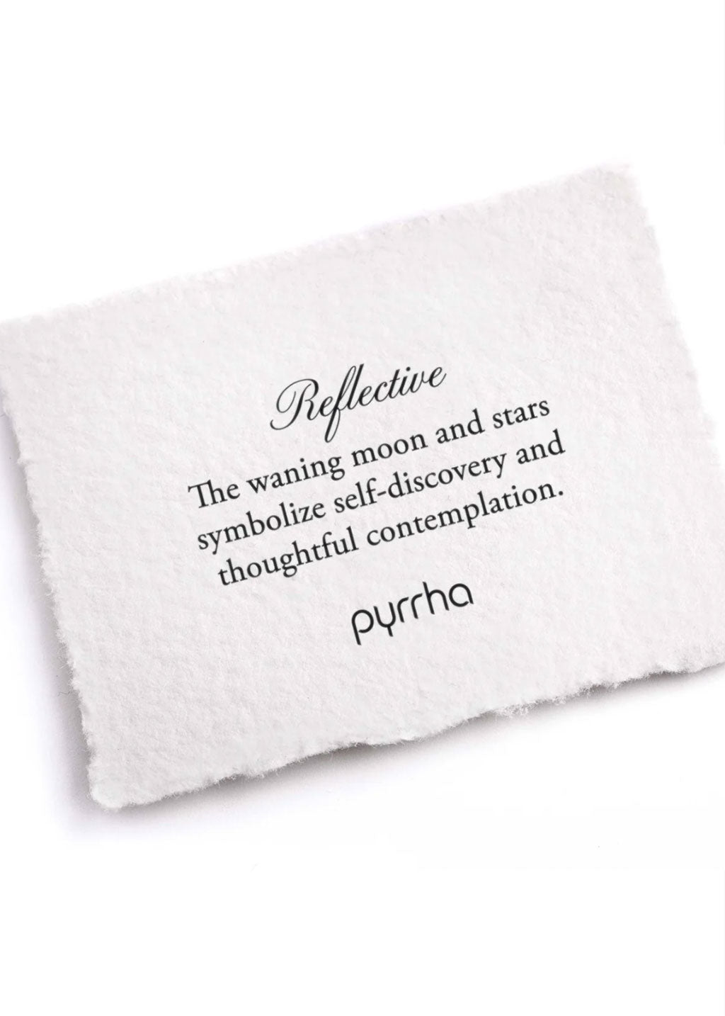 The waning moon and stars symbolize self-discovery and thoughtful contemplation. Celebrate what you love about yourself or cherish in others.