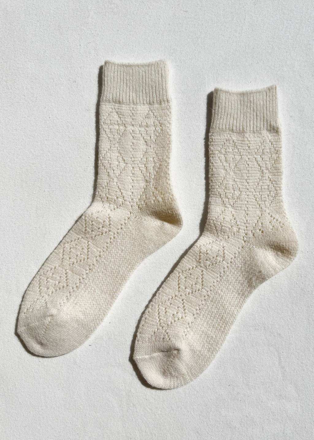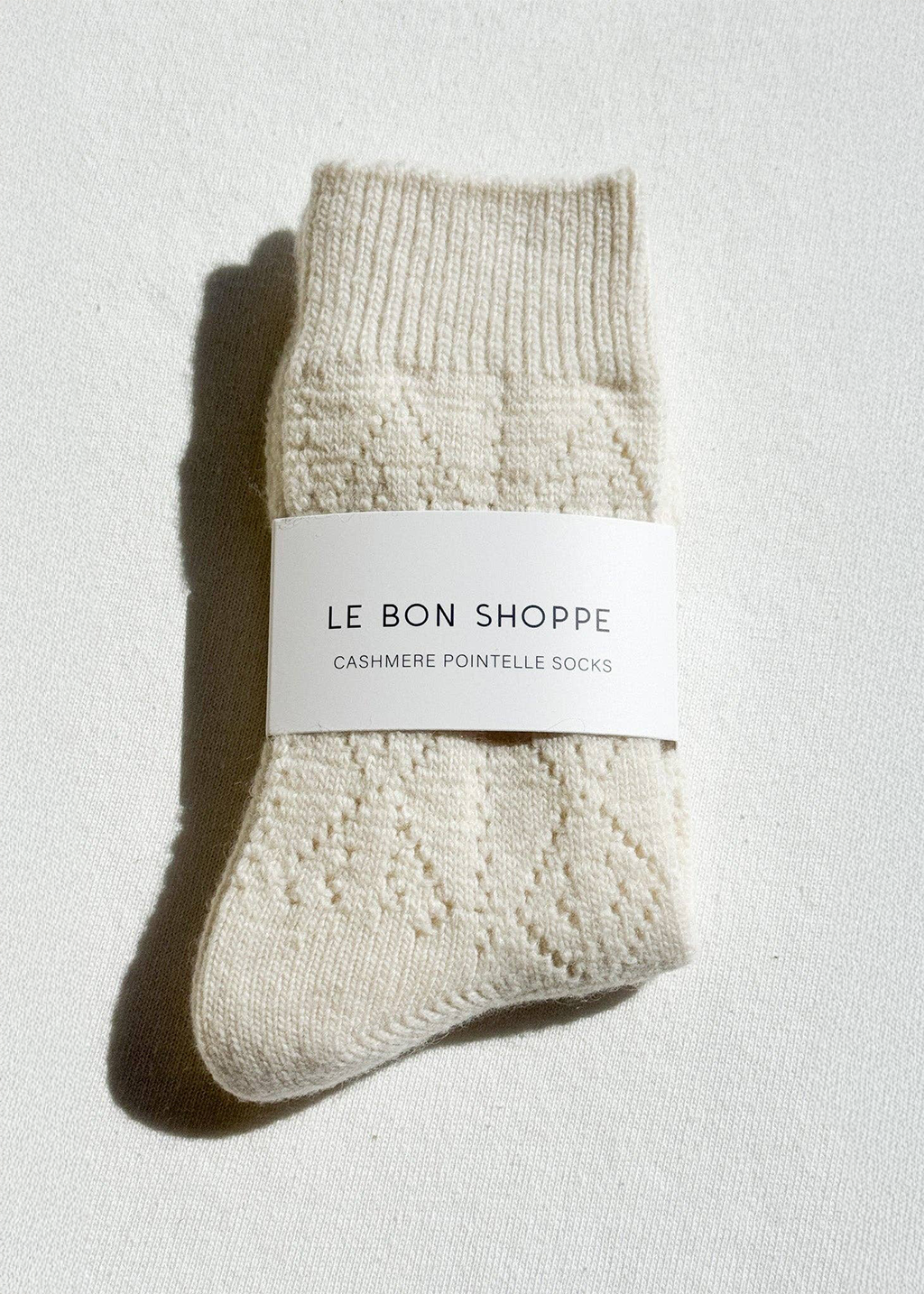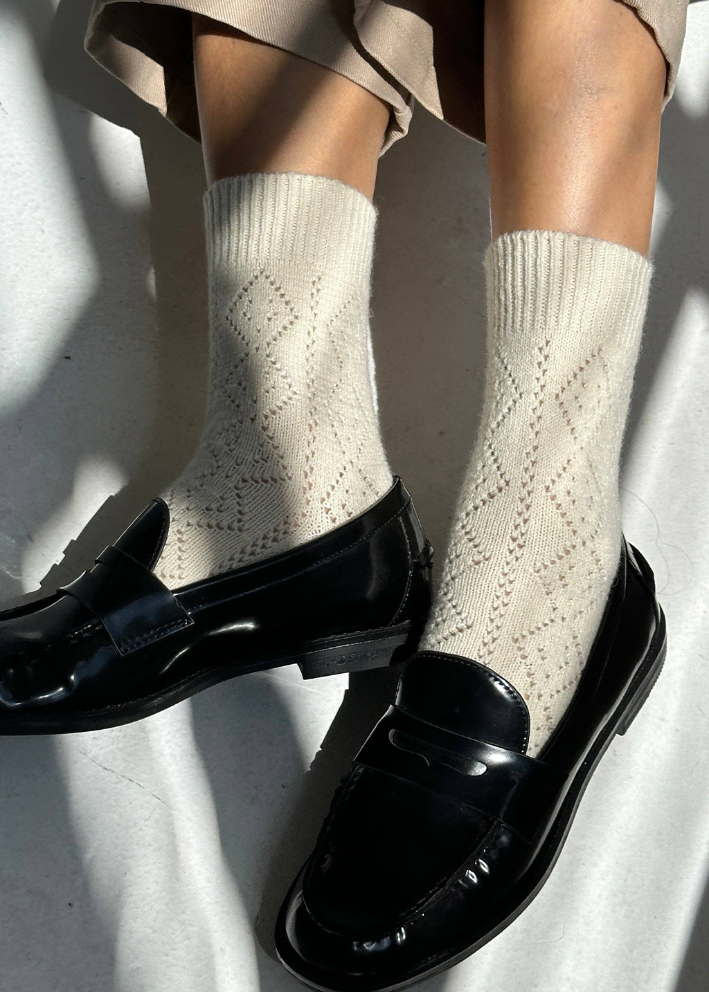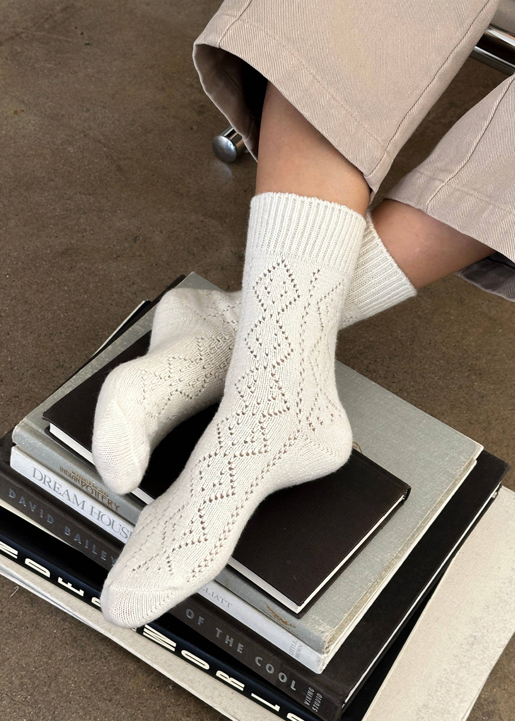 If Classic Cashmere had a little sister, this would be it. Cozy, soft, and full of charm. A crew-length silhouette with ribbed detail at the top and a delicate pointelle knit that adds just the right amount of sweetness to any look.