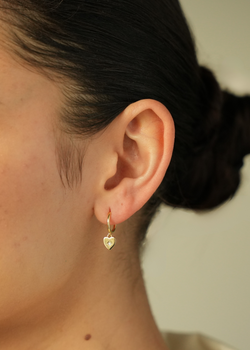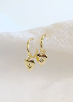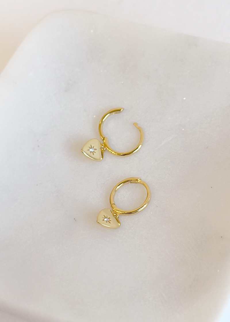 The Adore Huggie earrings feature delicate, dangling hearts with a sparkling cubic zirconia gem at the center. The simple huggie design allows for a comfortable and secure fit, while the starburst hearts add a touch of elegance to any outfit. Elevate your style with these charming and versatile earrings.