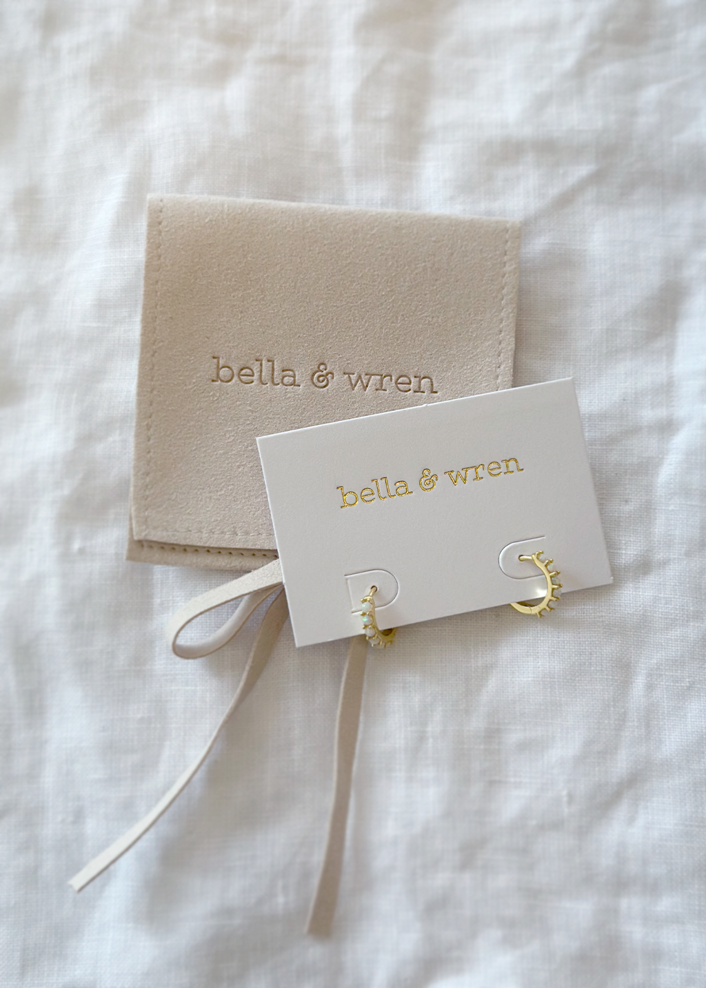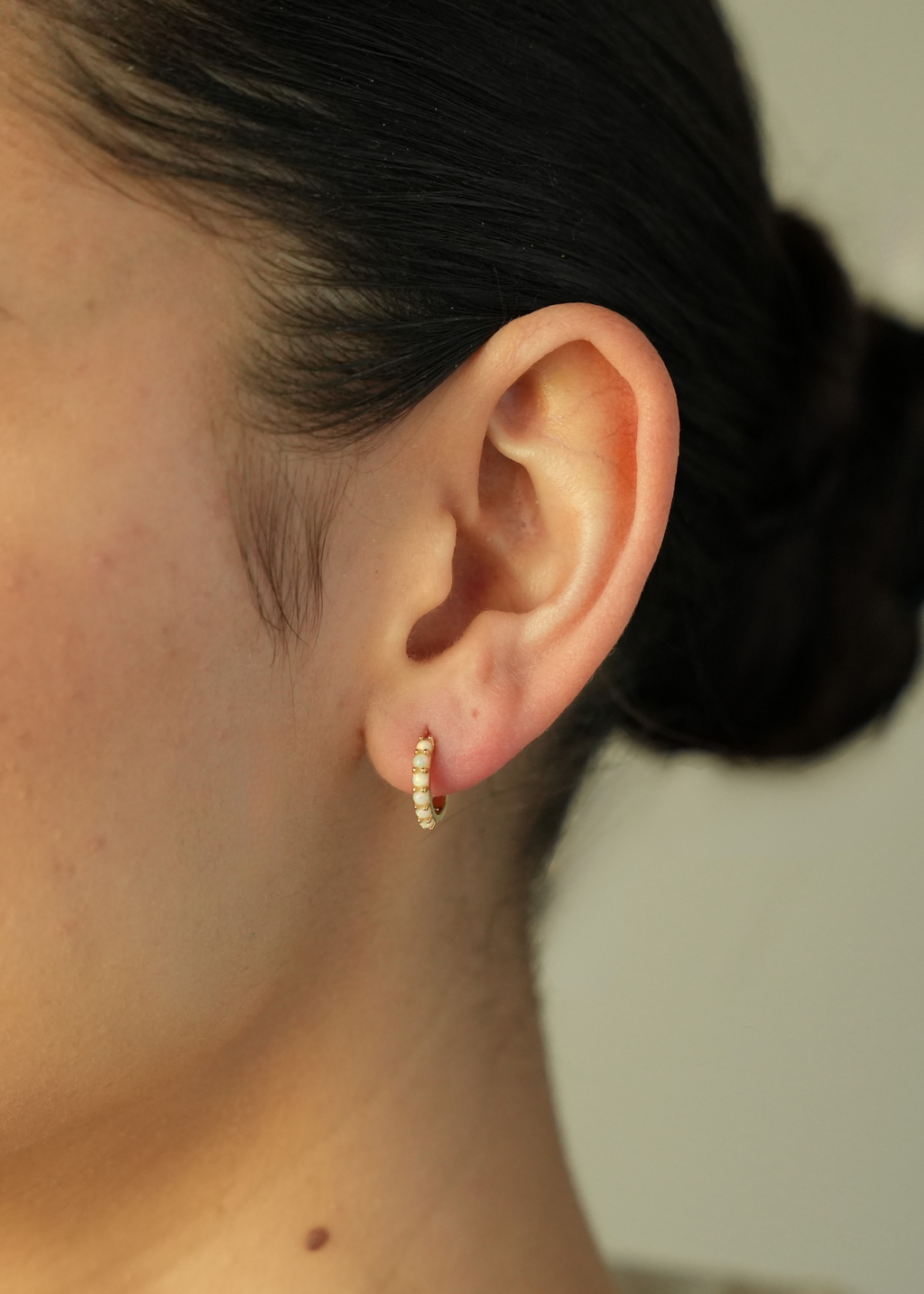 Our Bali Huggies add the perfect touch of elegance. Featuring a beaded opal band, these petite huggies make a classy addition to any accessory collection. Enjoy a perfect blend of beauty and sophistication when you wear our Bali Huggie earrings.