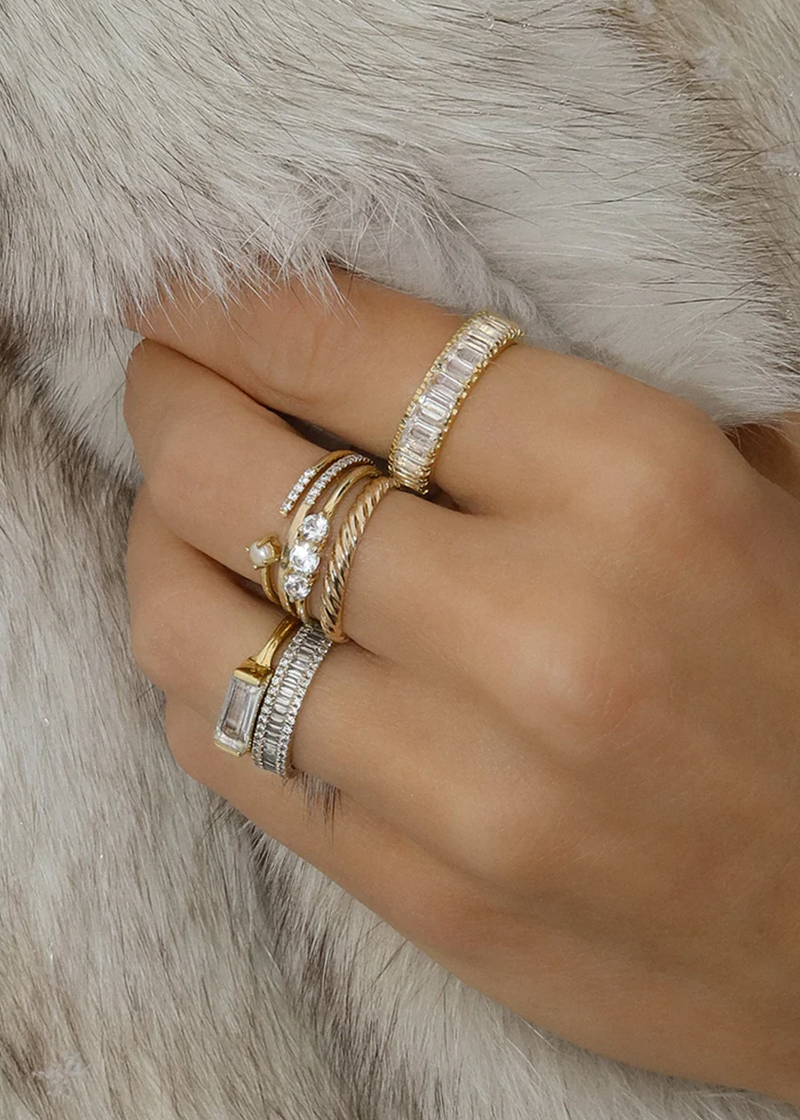 The Circa Ring guarantees endless glowing stacks! Three shining white topaz stones perfectly set on a gold band. Wear solo as a statement ring or stack with all your favourites.