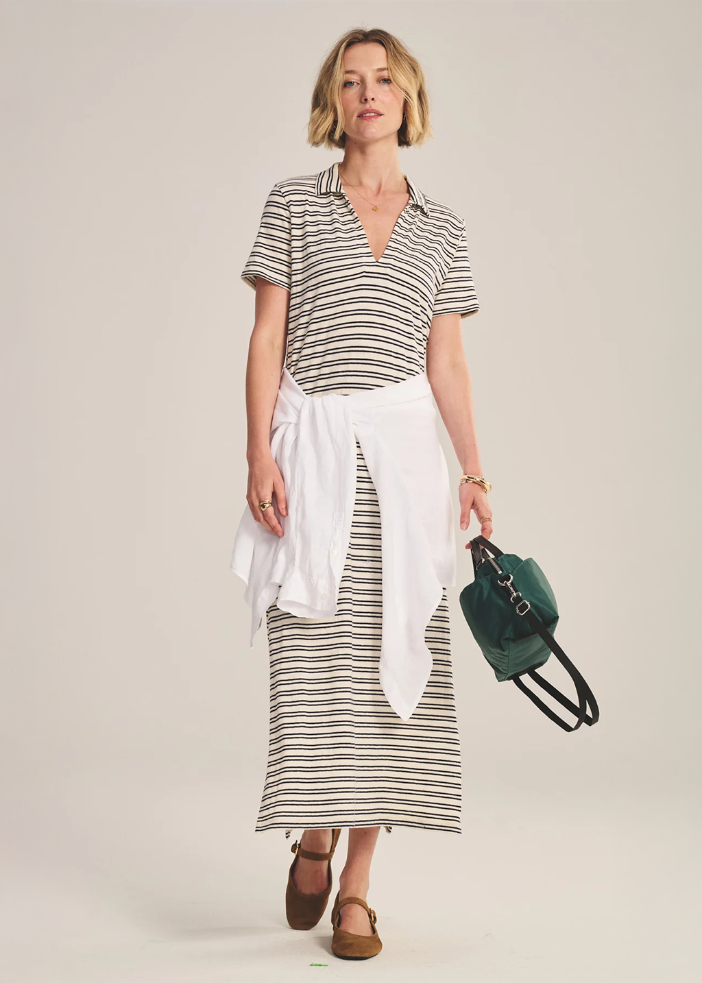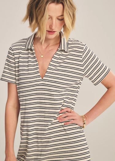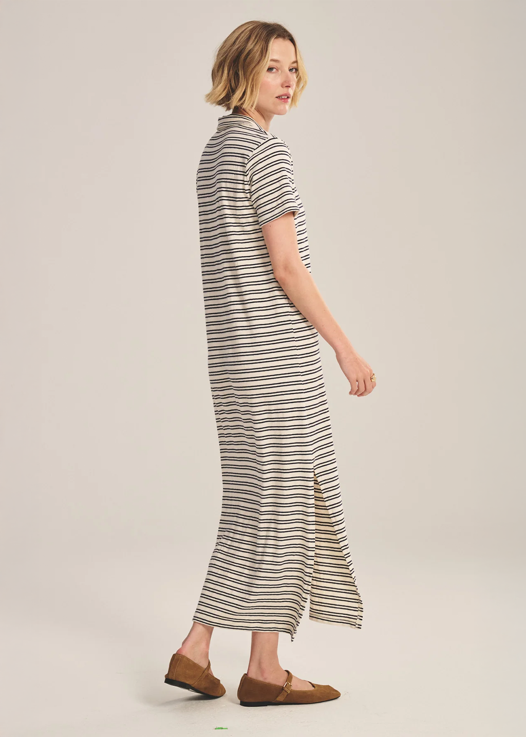 Casual yet refined, this T-shirt dress is crafted from soft yarn-dyed stripe jersey for a comfortable, everyday feel. Featuring a V-neckline, soft collar, short sleeves, and a side split hem, it offers relaxed ease with subtle detailing. A versatile staple for laid-back styling.