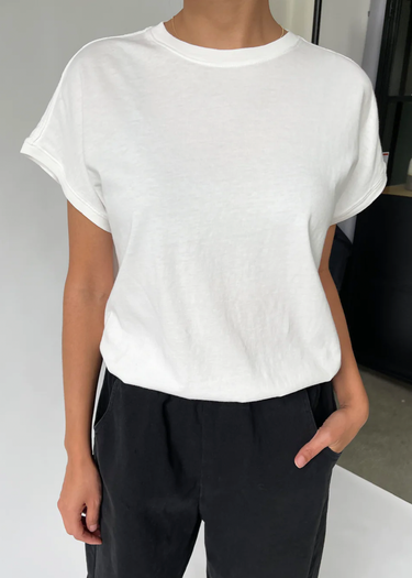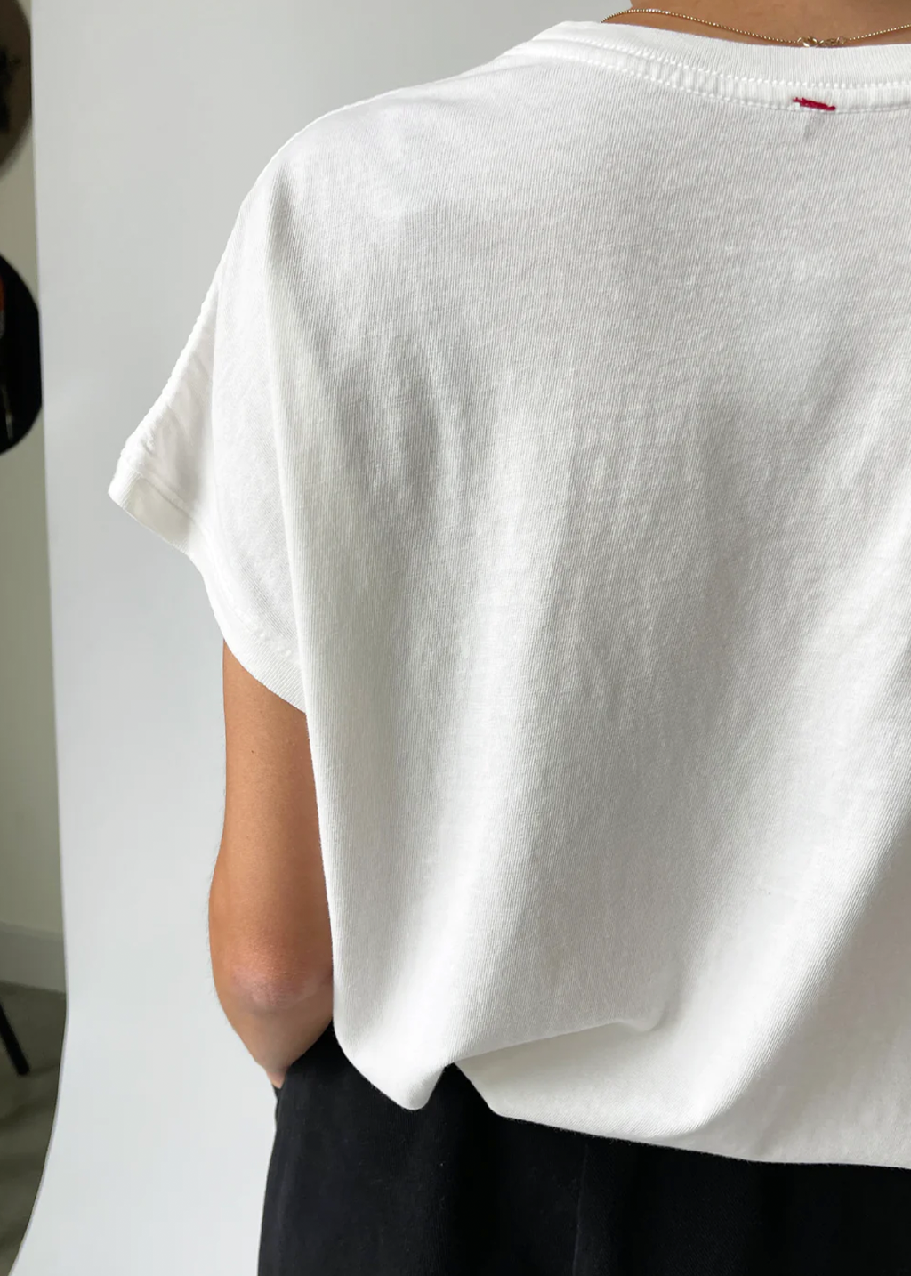 Ease Tee is an edgy dolman tee. She features a high crew neck, shoulder coverage without a sleeve, slightly rounded hem and a contrast rib banded sleeve opening and neck opening. With a crisp colour palette and enough length to tuck in or out. She is a cool girl's uniform.