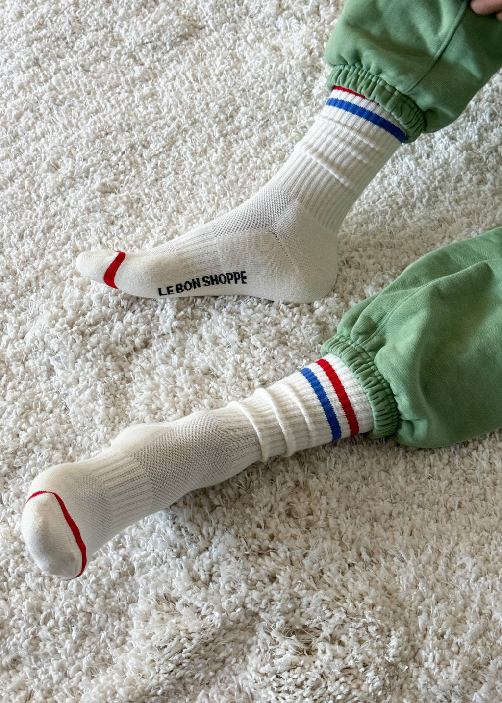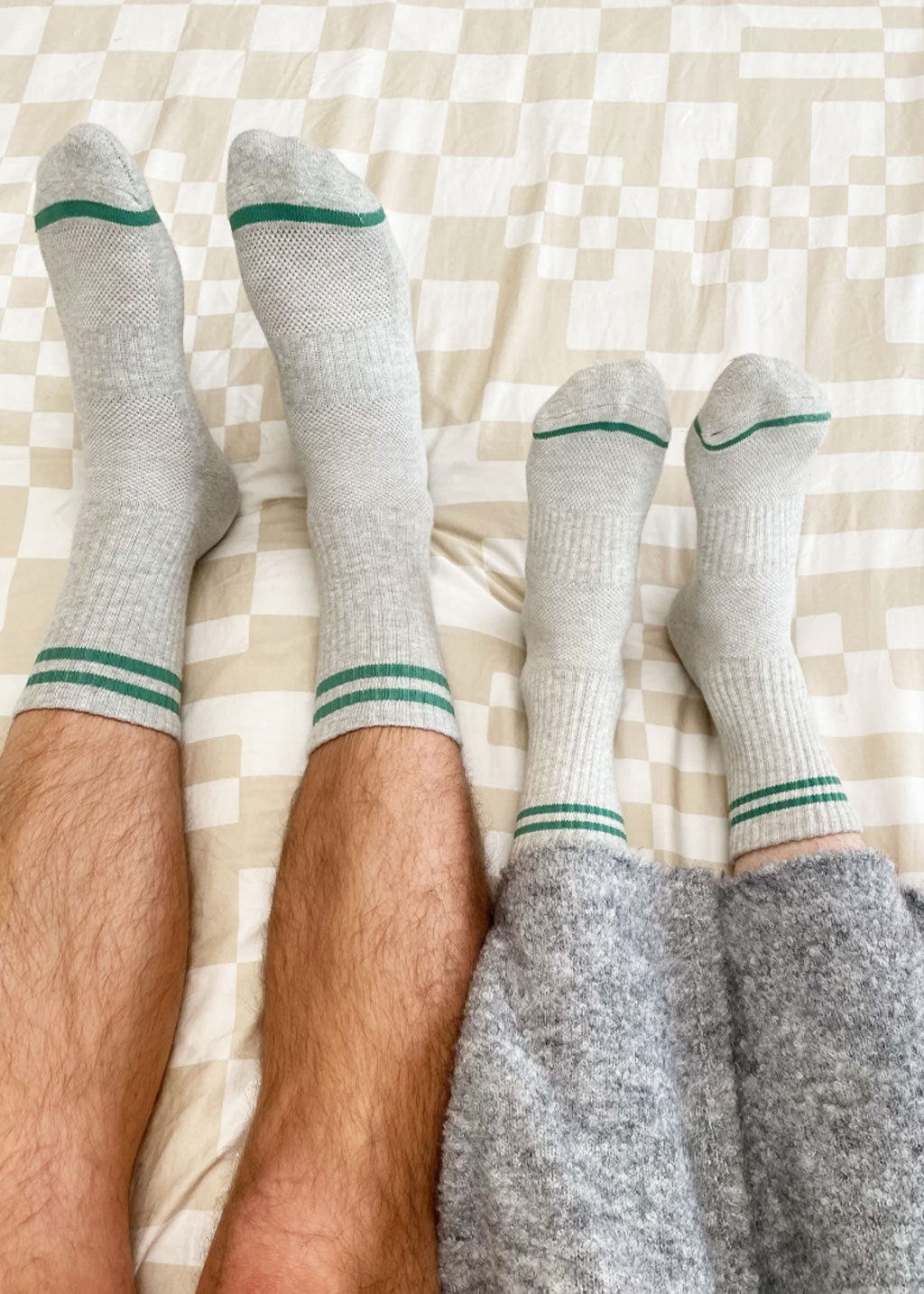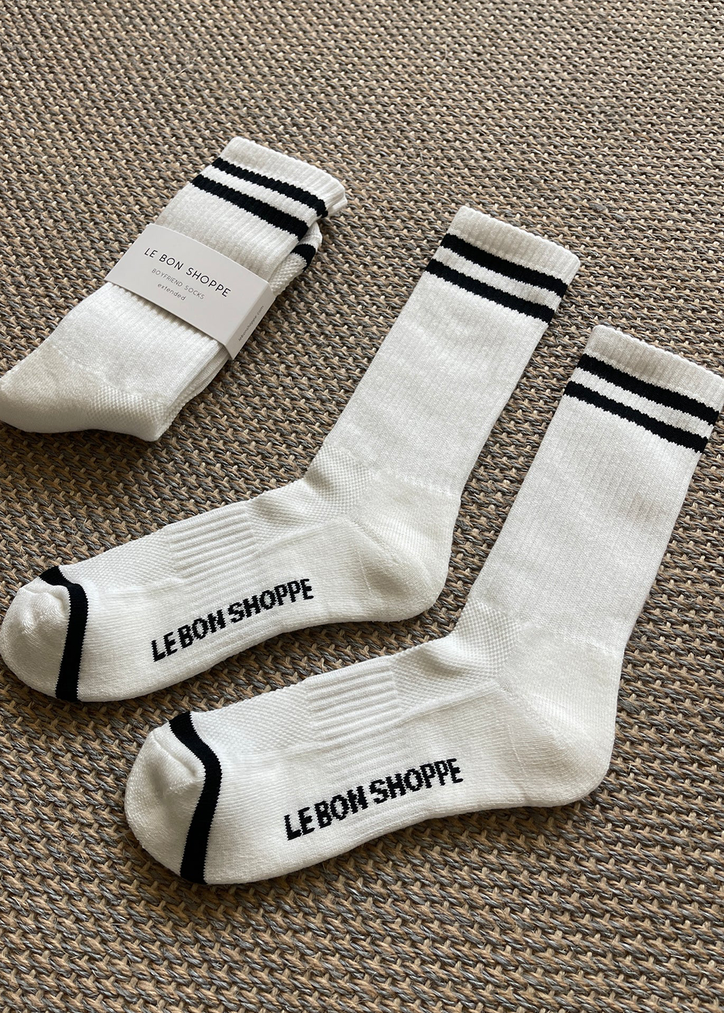 Due to popular demand they created the Boyfriend Socks in extended sizing which is unisex and men friendly! He is the same style as our bestseller and signature style Boyfriend Socks just slightly bigger all around for larger feet. He has a classic vintage sporty look but can be styled with all of your daytime looks and once of our favourite socks to lounge around the house.