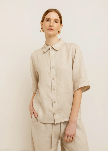 An easy statement with a utilitarian edge. The Kinsley Short Sleeve Shirt is crafted from 100% linen—naturally breathable and beautifully structured for warm weather. Designed with an oversized fit, it features a classic collar, button-front closure, drop shoulders, and wide short sleeves for a relaxed, modern shape.