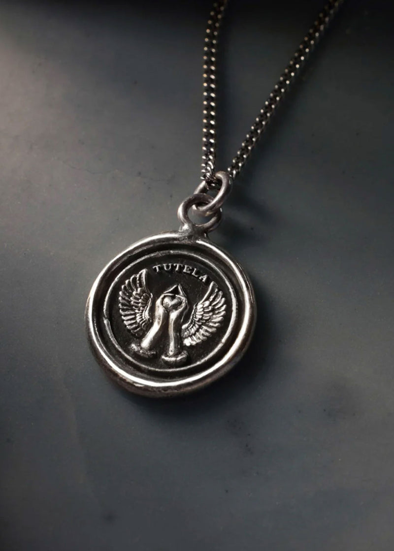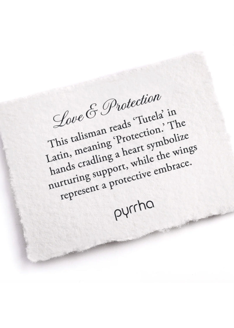 This talisman reads 'Tutela' in Latin, meaning 'Protection.' The hands cradling a heart symbolize nurturing support, while the wings represent a protective embrace.