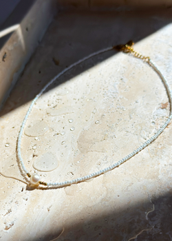 Effortless and timeless, the Serenity Necklace features a strand of dainty seed beads centred with a single luminous pearl, accented by golden details. Lightweight and waterproof, it’s designed to keep its beauty through swims, showers, and sun-soaked days. Whether worn alone for a touch of understated elegance or layered with other favourites, this piece captures the ease and charm of seaside living.