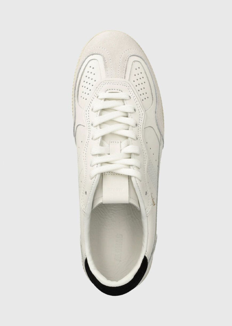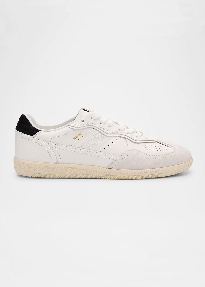 The Tb.490 sneaker is crafted from white tones with mixed textures—featuring a leather shoe with suede at the toe. Contrasting black trims add definition, while the white laces complete the design. Designed in a low-top silhouette sitting on rubber soles, it features classic details like exposed stitching and an embossed logo on the tongue and sides.